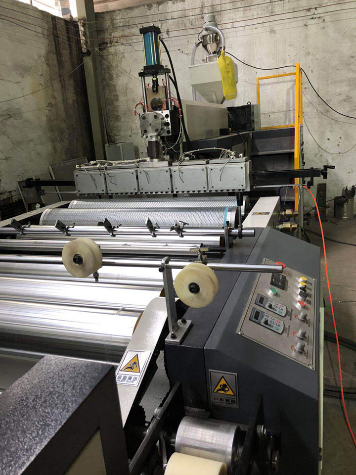 本機主要由擠出機、真空氣泡成型機構、點斷機構、收廢機構、電氣控制系統七大主要部件組成,實現原料從加料口加入,直至成品收卷自動控制的機電一體化產品。